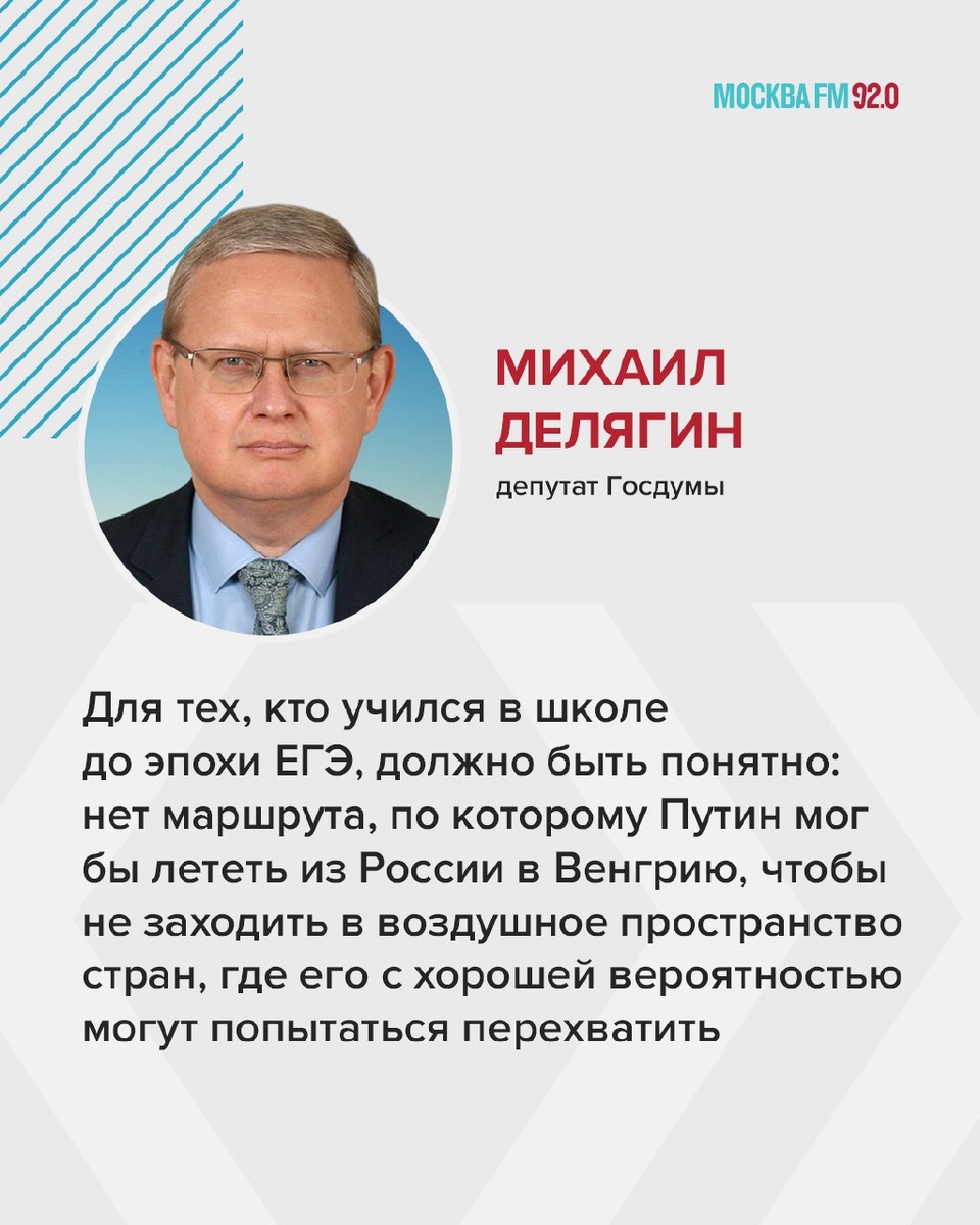 В ответ на пост 🗣 Путин может добраться до Будапешта вместе с Трампом Такой «сказочный вариант» встречи российского и американского лидеров выдвинул депутат Госдумы Михаил Делягин. Он отметил, что нет маршрута, по которому Путин мог бы лететь из России в Венгрию, чтобы не заходить в воздушное пространство стран, где самолёт могут попытаться перехватить: Но даже если предположить, что Россия каким-то образом сумеет эту задачу решить (давайте для модели предположим какой-нибудь сказочный вариант, например, суборбитальный полёт или просто в одном самолёте с Трампом), всё равно проблема останется: Венгрия признаёт решения международного уголовного суда, который выписал ордер на арест Путина. 📞 Сегодня вечером госсекретарь США и глава МИД РФ провели телефонный разговор. Марко Рубио назвал предстоящие встречи возможностью для Москвы и Вашингтона сотрудничать по урегулированию конфликта на Украине. 📌 Подписаться на Москва FM / Наш чат-бот / Мы в MAX