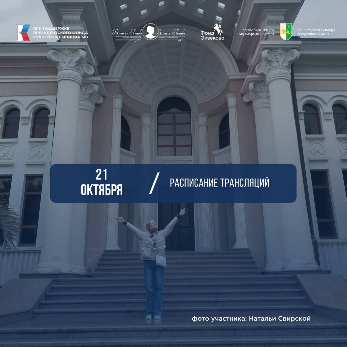 РАСПИСАНИЕ на 21 октября: прослушивания и мастер-классы 3-го тура IV Международного музыкального конкурса-лаборатории Алисы Гицба в Сухуме, Абхазии. Смотрите прямую трансляцию по ссылкам: 2️⃣1️⃣ ОКТЯБРЯ 2025: ✔️ 10:00 – 12:00 Мастер-класс Светланы Бондаренко «Искусство аккомпанемента» 💙 Смотреть в VK: https://vkvideo.ru/video-204276674_456239319 ✔️ 13:00 – 15:00, 16:00 – 18:00 Прослушивание номинации «Искусство аккомпанемента» 💙 Смотреть в VK: https://vkvideo.ru/video-204276674_456239320 ✔️18:00 – 20:00 Мастер-класс Алисы Гицба «Методы и эксклюзивные подходы в академическом пении». 💙 Смотреть в VK: https://vkvideo.ru/video-204276674_456239321 ❗️Сохраняйте, чтобы не пропустить! Завтра за час до начала мероприятий мы еще раз пришлем ссылки для подключения к трансляциям. 🎶 Подключайтесь! 🔗Наш сайт: gitsba-competition.com ❤️Проект «IV Международный музыкальный конкурс-лаборатория Алисы Гицба» проходит при поддержке Президентского фонда культурных инициатив и Правительства Ре