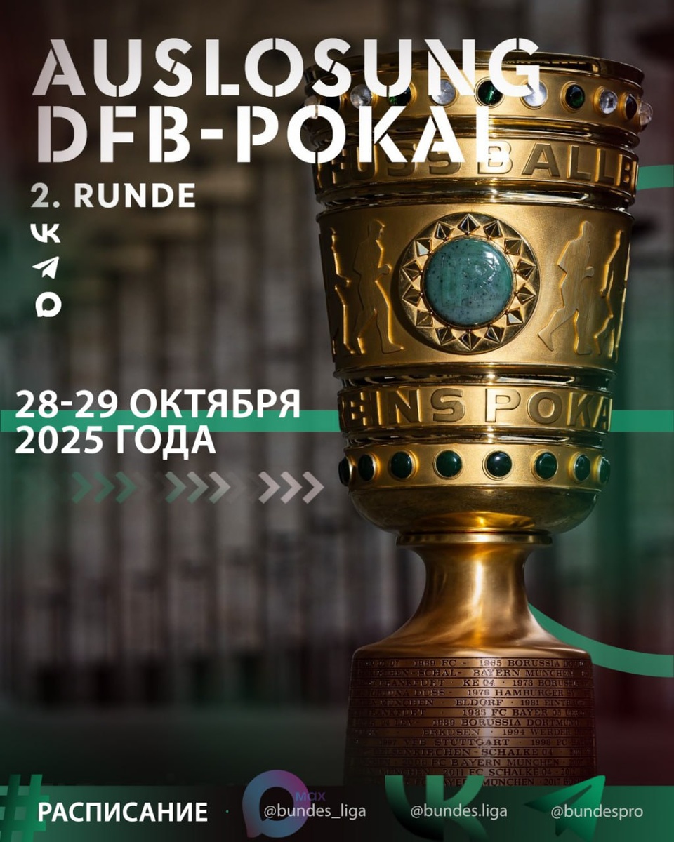 🏆 Расписание матчей второго раунда Кубка Германии по футболу. 📝 28 октября 2025 года, ⌚️ 20:30 «Хайденхайм» — «Гамбург» «Вольфсбург» — «Хольштайн Киль» «Герта» — «Эльферсберг» «Айнтрахт Ф» — «Боруссия Д» 📝 28 октября 2025 года ⌚️ 22:45 «Санкт-Паули» — «Хоффенхайм» «Энерги Котбус» — «РБ Лейпциг» «Боруссия М» — «Карлсруэ» «Аугсбург» — «Бохум» ✓ Самое крупное сообщество о чемпионате Германии в VK теперь есть в MAX!!!! 💥 max.ru/bundes_liga 📝 29 октября 2025 года, ⌚️ 20:00 «Иллертиссен» — «Магдебург» «Гройтер» — «Кайзерслаутерн» «Падерборн 07» — «Байер 04» «Майнц» — «Штутгарт» 📝 29 октября 2025 года, ⌚️ 22:45 «Дармштадт 98» — «Шальке 04» «Фортуна Д» — «Фрайбург» «Унион Берлин» — «Арминия Бил.» «Кёльн» — «Бавария» 🏆 Это Бундеслига, брат!