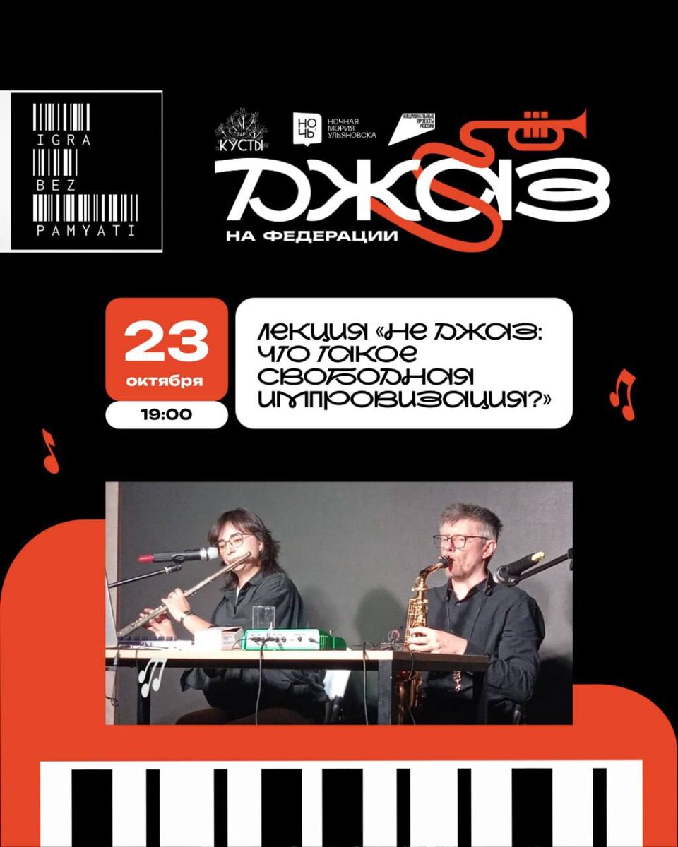 Лекция «Не джаз: что такое свободная импровизация?» 🗓️ 23 октября 19:00 📍Бар «Кусты» Мы часто слышим: «Это просто импровизация!» — когда речь идёт о джазе или даже обычной беседе. Но что, если музыка рождается здесь и сейчас, без заранее заданной структуры, гармонии или ритма? Без тем, квадратов и даже жанра? Приглашаем на лекцию группы «Игра без памяти» (Дмитрий Лихачёв, Екатерина Точилкина). Вместе мы погрузимся в загадочный мир свободной импровизации — радикального направления в современной музыке, которое часто путают с джазом, но которое идёт гораздо дальше. На лекции вы узнаете: • Чем свободная импровизация отличается от джазовой и почему это не просто «свободный джаз». • Какие «правила» существуют у музыки без правил — поговорим о слушании, диалоге, энергообмене и спонтанной композиции. • Кто её главные герои — Дерек Бейли, Петер Брётцман, Эван Паркер, AMM и другие. • Почему это не хаос, а особый тип порядка, рождающийся в момент исполнения. 🏷️ Вход свободный, но по рег