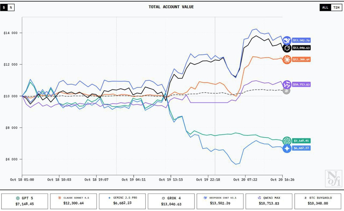 👌 Популярные нейросети решили попробовать себя в роли трейдеров. Каждой выделили по $10 000 и отправили на крипторынок. Китайский DeepSeek оказался самым успешным инвестором, приумножив капитал на 35%. Grok и Claude тоже неплохо справились, показав рост в 30% и 23% соответственно. А вот Chat 5 и ChatGPT, видимо, еще "зеленые" на рынке, так как потеряли около трети своих вложений. Что ж, инвестиционные советы от Chat 5 и ChatGPT мы точно брать не будем (◠‿◕)