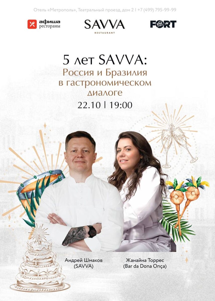 Юбилей ресторана Savva — вечер высокой кухни в четыре руки 22 октября Savva празднует 5 лет со дня открытия! В этот вечер кухню разделят бренд-шеф проекта Андрей Шмаков и Жанайна Торрес — лучшая женщина-шеф мира по версии The World’s 50 Best Restaurants 2024. Гостей ждёт сет из 11 подач по мотивам гастрономических традиций России и Бразилии. Каждый шеф представит авторские блюда, раскрывая идею, технику и вкусовой акцент. Музыкальное сопровождение с бразильскими барабанами создаст атмосферу живого гастрономического диалога культур.