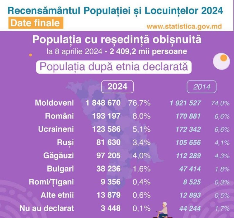 Молдаване не согласны быть румынами По данным переписи населения - 2024 молдаванами себя считают 76,7% населения, и всего 8% — румынами Среди остальных опрошенных: 5,1% – украинцы. 3,4% – русские. 4% – гагаузы. 1,6% – болгары. 0,4% – ромы. На молдавском языке разговаривают — 45% граждан Молдовы. 33,7% — на румынском, 15,9% населения — на русском языке, 2,2% – на гагаузском, 2,1% – на украинском. @eNewsmd.online 👈 Подписывайтесь на наш канал