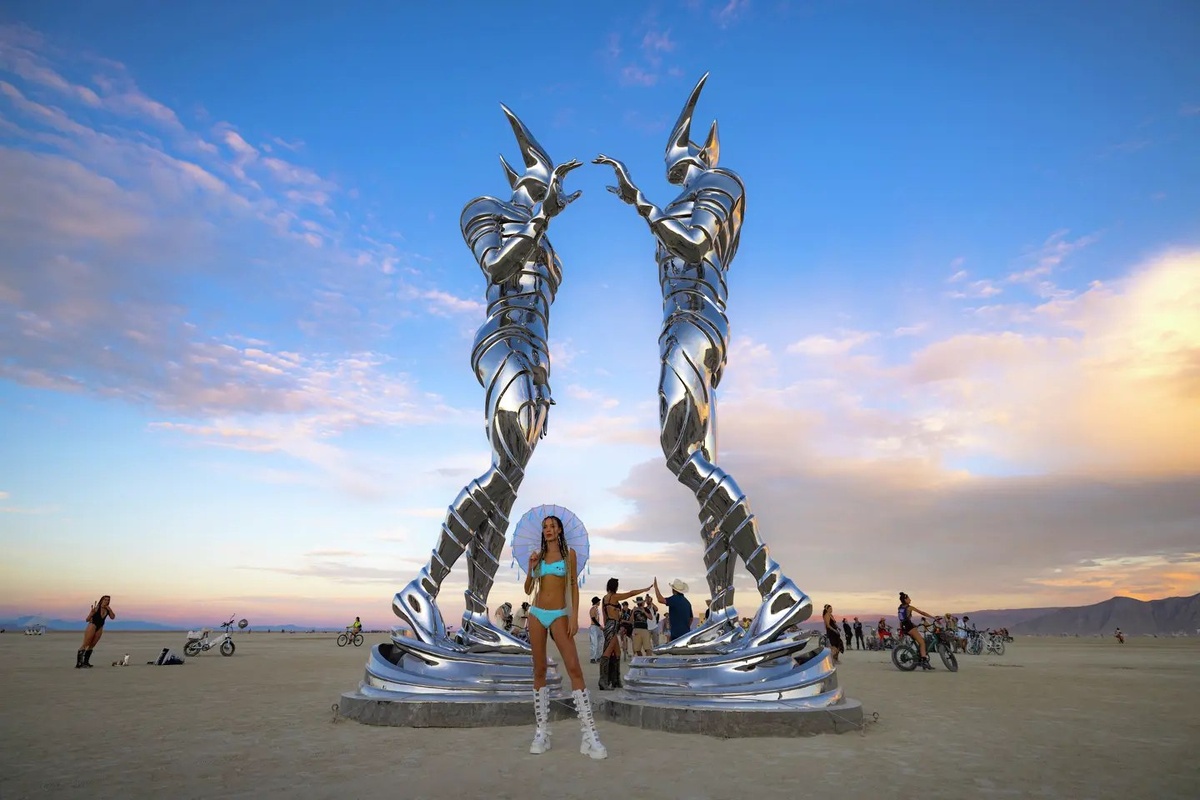 Каждый год в пустыне Блэк Рок штата Невада в США проходит фестиваль самовыражения Burning Man. Тысячи участников из разных стран выражают искусство через необычные костюмы и арт-инсталляции. В этом году мероприятие стало настоящим испытанием. Песчаная буря с порывами ветра до 84 км/ч накрыла город и разрушила десятки лагерей и арт-объектов. Несмотря на погодные условия и сложности в организации, Burning Man снова подарил миру уникальные произведения искусства. 1. Храм Глубины (Temple of the Deep) Главный храм этого года — проект испанского архитектора Мигеля Аррайса Гарсиа. Пространство задумано как место радикального принятия: здесь можно сидеть со своими эмоциями, проживать горе и находить силы для исцеления. Архитектура вдохновлена японским искусством кинцуги: храм словно «склеен» из трещин, где разломы становятся метафорой боли, восстановления и внутренней силы. 2. Церемониальный комплекс Каюмари (Kauyumari Ceremonial Center) Одна из самых ярких и обсуждаемых работ фестиваля — гига