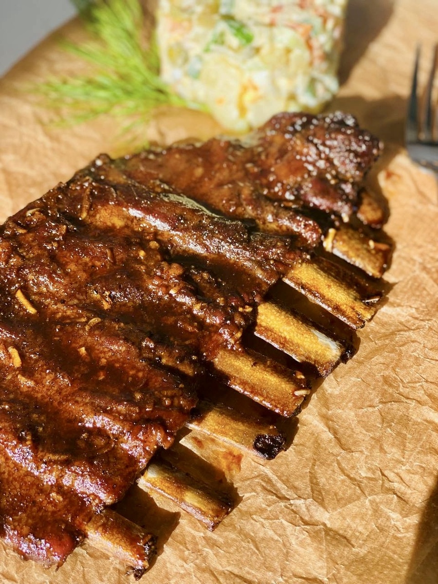 Ингредиенты: ▫️свиные ребра — 300 г ▫️соль — по вкусу ▫️перец черный свежемолотый — по вкусу Глазурь: ▫️соус терияки — 2 ст. л. ▫️соевый соус — 2 ст. л. ▫️оливковое масло — 2 ст. л. ▫️чеснок — 2 зубчика ▫️уцхо-сунели — 1 щепотка ▫️паприка копченая — 1 щепотка Способ приготовления: 1. Ребрышки промыть, обсушить, очистить от пленки. После чего натереть солью и перцем. 2. Противень или форму для запекания застелить пергаментом, выложить ребрышки, запечатать фольгой и отправить на 1,5 часа в духовку, разогретую до 170°C. 3. Смешать ингредиенты для глазури. 4. Ребрышки смазать глазурью и отправить на 10 минут в духовку, увеличив температуру до 200°C. Приятного аппетита!