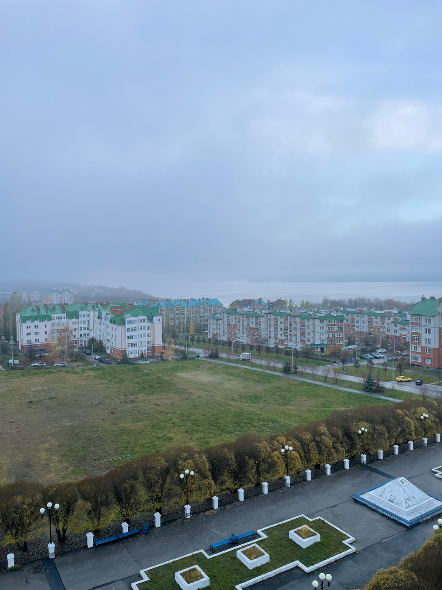 За окном над Волгой лёгкий туман, небо серо-голубое, дождя нет. Воздух свежий, чуть прохладный.