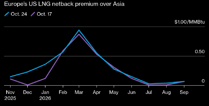На это указывают фьючерсные кривые на Nymex/ICE, пишут эксперты BloombergNEF. Размер премии, с которой американский СПГ продается в Европе относительно Азии (USD за MMBtu). Голубым — по состоянию на 24 октября, фиолетовым — по состоянию на 17 октября. Данные: Nymex/ICE, источник: Bloomberg В период с ноября 2025 года по сентябрь 2026 года американским производителям СПГ будет выгоднее отправлять топливо в Европу, чем в Азию. На это указывают фьючерсные кривые на Nymex/ICE, пишут эксперты BloombergNEF. Европейская ценовая премия (относительно Азии) по ноябрьским отгрузкам составит $0,15 за MMBtu (миллион британских тепловых единиц). В следующие месяцы показатель продолжает расти, достигая пика на уровне $0,94 MMBtu для мартовских отгрузок, после чего начинает снижаться, опускаясь почти до нуля для июльских отгрузок. На неделе до 24 октября европейская премия для декабрьских и январских отгрузок подскочила сразу на $0,20 за MMBtu, что стало максимальным изменением для всех отрезков фьюче
