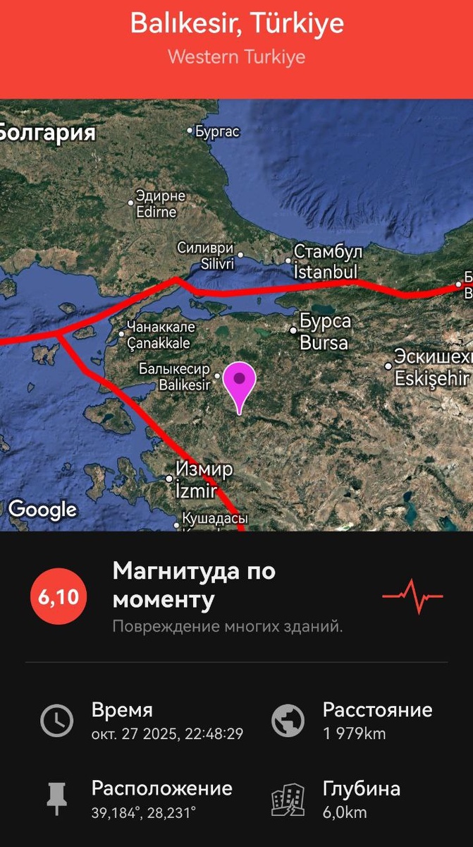 В ответ на пост Согласно предупреждению от 26 октября (и не только ему, постов по теме было много, а последний пост был сегодня) произошло землетрясение магнитудой М6.1 на северо-западе Турции. Сейсмическая энергия сброшена не в полном объёме, возможна повторная сильная сейсмика в данной зоне в течение 9 дней. ===== According to the warning dated October 26 (the last post was today), an earthquake of magnitude M6.1 occurred in northwestern Turkey. The seismic energy has not been fully discharged, and repeated strong seismic activity in this area is possible within 9 days.