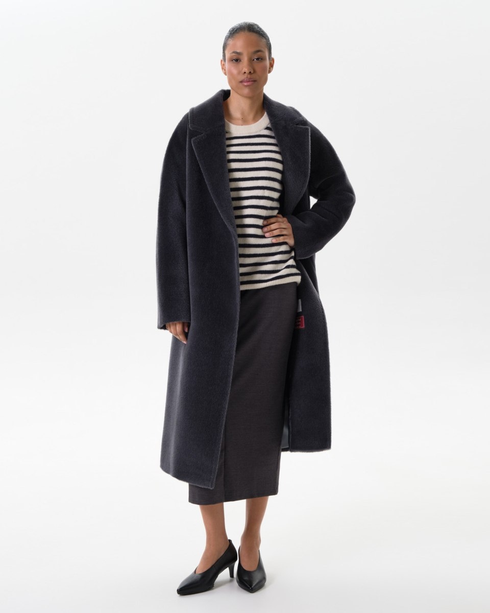 Эффектное макси-пальто 582L со шлицей. Двубортное пальто на подкладке застегивается на кнопки. Для наилучшей посадки предусмотрена внутренняя пуговица. По бокам расположены прорезные карманы с листочкой. Эта новая в коллекции модель выполнена в семи разных оттенках. Пальто можно носить как с поясом, так и без, создавая яркие выразительные образы. Полная длина позволяет максимально раскрыться благородной фактуре итальянской ткани из шерсти альпаки.