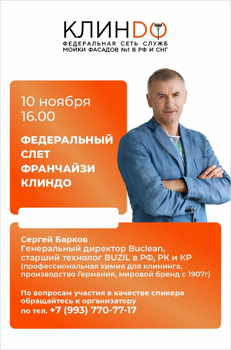 Спикер Слета франчайзи КЛИНДО - Сергей Барков – Генеральный директор Buclean, старший технолог BUZIL в РФ, РК и КР (профессиональная химия для клининга, производство Германия, мировой бренд с 1907г) Коллеги, партнеры, друзья! Холдинг «ИННОВАКЛИН» приглашает новых и действующих франчайзи на Второй федеральный слет сети «КЛИНДО», который состоится 10 ноября в Москве. Это ключевое событие компании, призванное стать катализатором вашего роста в наступающем году. Мы соберемся в понедельник, 10 ноября, с 09:00 до 18:00, в историческом центре столицы возле здания Министерства Иностранных Дел РФ, чтобы в деловой и динамичной атмосфере задать новые векторы развития, обменяться опытом и получить мощный заряд энергии от общения с единомышленниками. Программа слета сконцентрирована на максимальной практической пользе для вашего бизнеса: Утренняя сессия «Стратегия и инновации» будет посвящена фундаментальным основам. Вы услышите стратегию и новшествах сети от основателя компании Ярослава Щерба