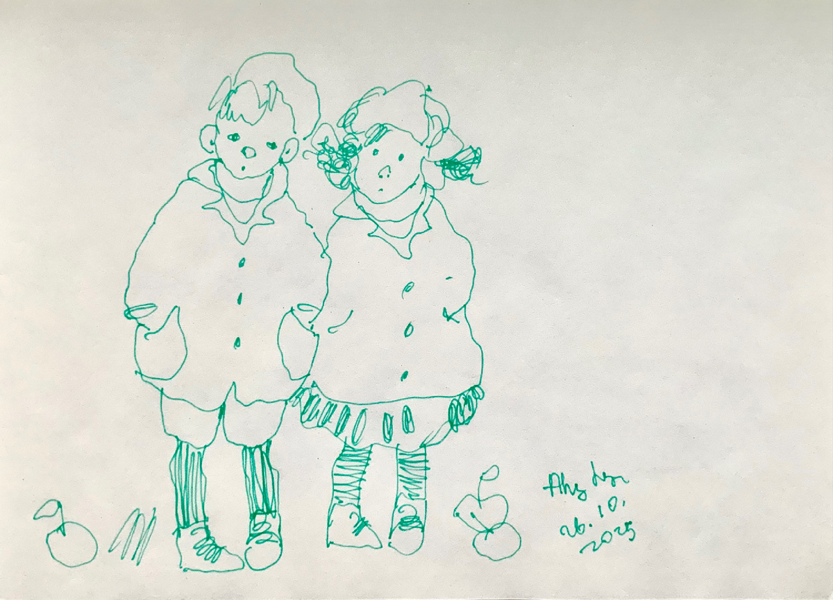 На траве валяются яблоки, а ребята горошковые 🍏 🧒🏼 🌾 👧🏼 🫛 Как же так? 🤔 Просто они нарисованы светло-зеленым линером. Такой оттенок часто называют мятным, но порой еще и гороховым. И то, и другое название приятно, но «горошковый» звучит веселее 😀 💚 🌿