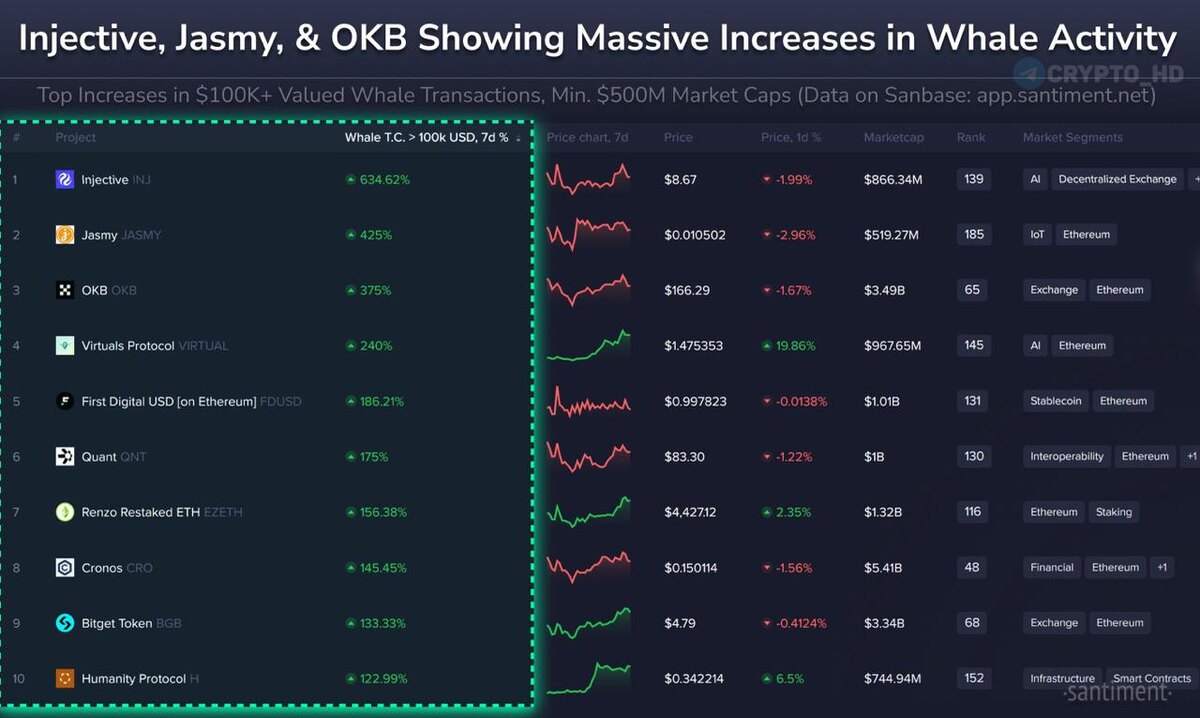 #ончейн #рейтинг 🐳 Santiment: ТОП-10 токенов по росту активности китов за последнюю неделю. 1. Injective #INJ 2. Jasmy #JASMY 3. OKB #OKB 4. Virtuals Protocol #VIRTUAL 5. First Digital USD (на Ethereum) #FDUSD 6. Quant #QNT 7. Renzo Restaked ETH #EZETH 8. Cronos #CRO 9. Bitget Token #BGB 10. Humanity Protocol #H Crypto Headlines