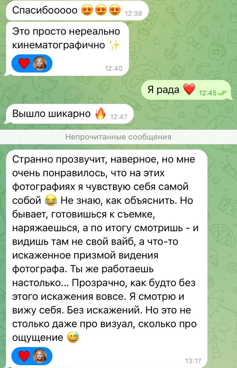 «На этих фотографиях я наконец увидела себя - без искажений.» Иногда я бываю жадным шефом. Знаешь, тем, кто умеет готовить гениально, но держит рецепт в секрете даже от себя. Обычно клиентки приходят ко мне не из рекламы. Их передают буквально из рук в руки. Потому что после съемки невозможно не рассказать, что произошло. Работа со мной не для всех. Она подойдет тем, кто устал смотреть на свои постановочные фото и думать: «Это не я. Это просто красивая картинка» Тем, кто хочет увидеть живую, честную себя. Механика простая: 1. Я убираю правильность 2. Мы дышим, двигаемся, разговариваем 3. Я не ставлю в позу, ловлю момент, когда ты перестаешь играть роль. Так работает мой принцип «прозрачная съемка» Минимум режиссуры. Никаких визуальных масок и поз. Когда ты просто есть. И живешь. Здесь и сейчас. Я долго берегла свою суперсилу. Искренне считала, что брать деньги за то, что мне слишком просто, как-то неправильно. Жалела идеи, жалела деньги клиентов, ждала идеальных съёмок, особого