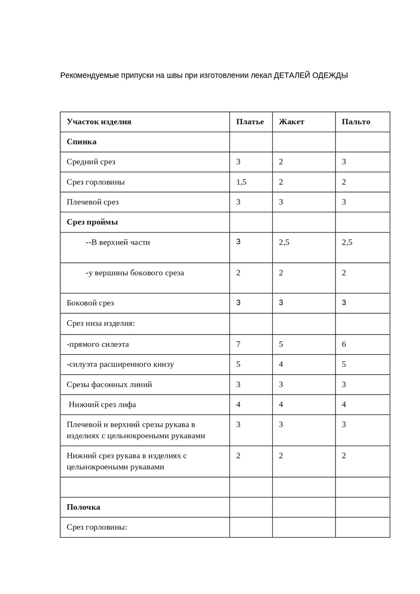 Рекомендуемые припуски на швы при изготовлении лекал ДЕТАЛЕЙ ОДЕЖДЫ