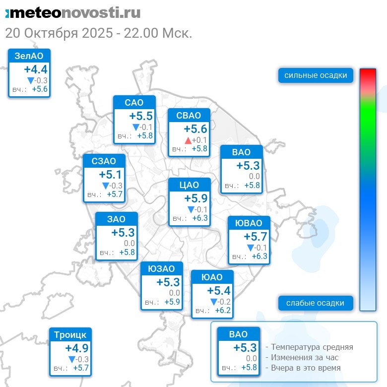 В 22:00 в Москве было от +4.3°C до +6°C, средняя температура +5.4°C #погода #Москва #осень #температура #20октября #понедельник