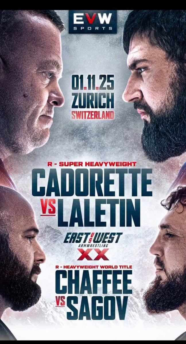 🔥 Постер от East vs West на 2 главных матча их юбилейного инвента. ✔️ Вот такой вот достаточно неплохой постер подготовили East vs West в предверии своего 20-го инвента. На постере показаны две главные пары вечера: Джерри Кадоретто vs Виталий Лалетин и Дейв Чаффи vs Ибрагим Сагов. ❓На какой стороне постера расположены победители этих пар, по вашему мнению? 🔥 - слева ♾ 🏆 - справа Наш канал | Чат | Магазин @MusiSs_Sport_bot #armwrestling #EvW