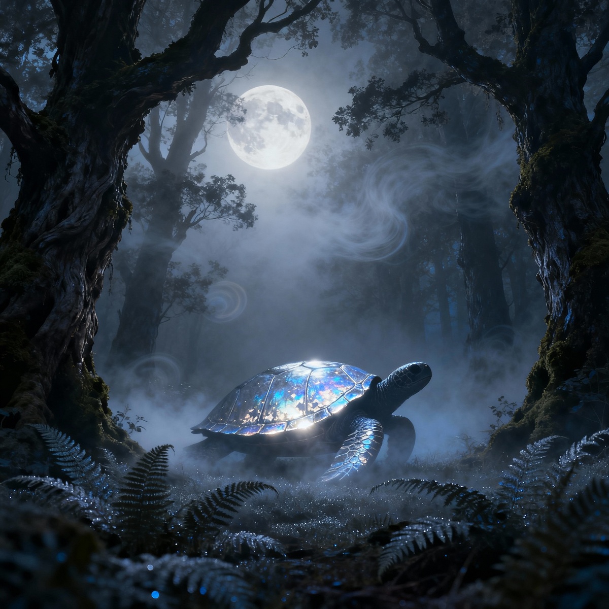 Читайте и слушайте нас в телеграмм. В полнолуние середины октября древний дух ночи — Лунная Черепаха — спускается из потаённых рощ, чтобы пройти по тонкому мосту между мирами. Её панцирь переливается серебристым светом, будто соткан из лунных бликов, а глаза мерцают, словно крошечные звёзды. Легенда гласит, что прохожие слышат тихий, почти невидимый топот и шёпот, словно кто-то бродит рядом. Но оглянувшись, они не находят ни единого следа. Иногда в тумане мелькает огромная тень, похожая на черепаху, и сердце увидевшего её замирает от непонятного страха. Считается, что Лунная Черепаха является привратницей между миром живых и миром предков. Тот, кому удастся наступить на её отражение в луже, увидит облик умершего близкого и услышит его последнее послание. Раньше в селениях Западной Руси в ночь на 16 октября старейшины выходили на озеро с серебряными чашами: в них они собирали лунный свет , отражённый в воде. Считалось, что чашу нужно быстро унести домой и оставить у изголовья — тогда