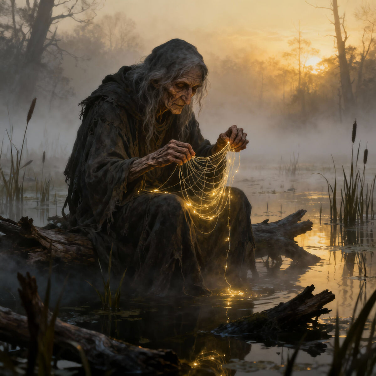 Читайте и слушайте нас в телеграмм. В предрассветные часы поздней осени, когда первые заморозки окутывают землю молочным туманом, из глубин болотных топей восстает древняя Туманная Пряха. Её призрачный силуэт мерцает между ивами, а длинные седые волосы сплетаются с клочьями тумана. В руках она держит веретено из лунного света, на котором прядет невидимые нити человеческих судеб. Путники рассказывают, что в туманную октябрьскую ночь можно услышать тихое пение старинных песен. Те, кто осмелится подойти ближе, видят в клубах тумана мерцающие серебристые нити, которые тянутся от земли к небу. Говорят, каждая нить — это чья-то жизнь, и Пряха решает, когда её оборвать. Легенда гласит, что тот, кому удастся разглядеть её лицо сквозь туман, узнает свою судьбу до конца дней. Но смотреть нужно осторожно — если Пряха заметит любопытного, она может включить его нить в свой узор раньше времени. В древних поселениях Северной Руси накануне 19 октября женщины выходили к реке с серебряными нитями в рук