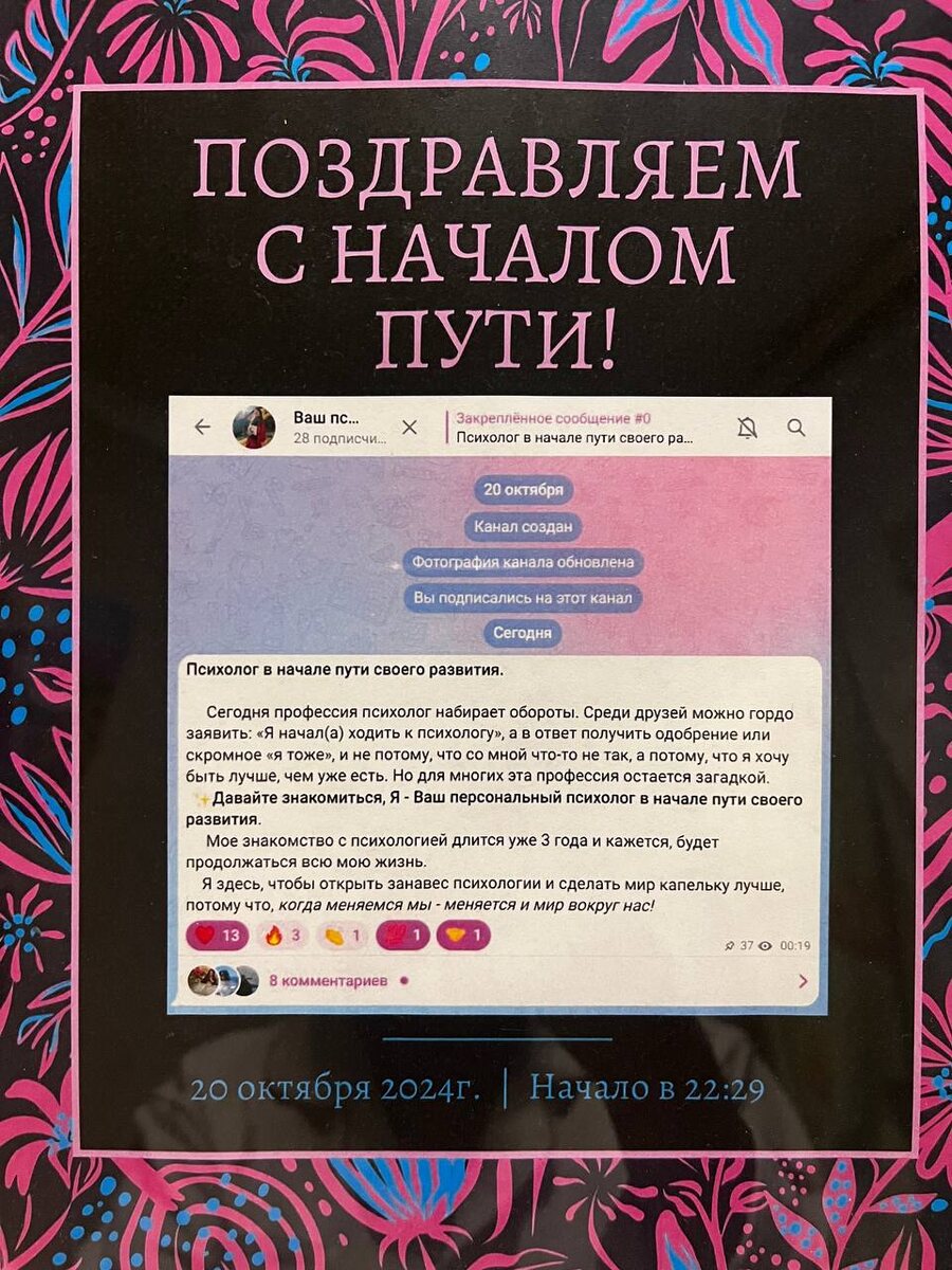 Каналу — 1 год! Ровно год назад в 22:29 я сделала глубокий вдох и нажала кнопку «Создать канал». Это был шаг в неизвестность: ❓А будет ли это кому-то интересно? ❓А смогу ли я быть полезна? Сегодня, оглядываясь назад, я испытываю одну главную эмоцию — огромную, светлую благодарность. Спасибо вам: ✨ Всем, кто просто читает. Ваше невидимое присутствие дает мне понять, что темы, которые я поднимаю, важны. ✨ Всем, кто ставит лайки и пишет комментарии. Ваша обратная связь — как компас, который помогает мне выбирать направления. ✨ Всем, кто делится постами с друзьями. Для психолога нет большей радости, чем знать, что слово нашло того, кому оно было нужно. Этот канал — не монолог, а наш с вами общий диалог. Спасибо, что делаете его живым, искренним и наполненным смыслом. С ростом канала расту и я: 🍂писать посты, 🍂выбирать темы, 🍂заинтересовывать читателя, 🍂записывать кружочки, 🍂проводить трансляции, 🍂личные сессии…. Очень многое именно здесь я начала делать впервые — через страх, в
