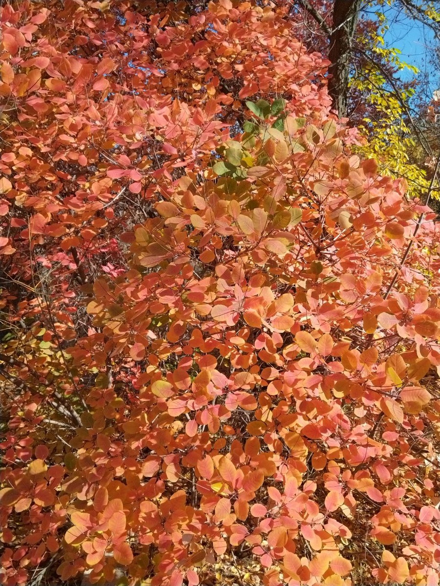 С разных сторон оно открывается по-разному: с одной — яркое, с густой золотой листвой и светится на солнце; с другой — листья уже с красным оттенком, сквозь них виден чёрный ствол.