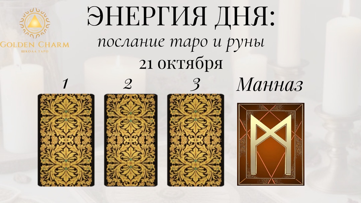 Заказать личный расклад тут✅ Прогноз на 21 октября : что тебя ждёт Приходи на обучение Таро ✅ Выбери карту — 1, 2 или 3 — и узнай, какой путь для тебя: 1. 5 Мечей Возможно столкновение мнений, споры. Важно сохранять спокойствие и мудрость, чтобы выйти победителем без потерь. 2. Королева Жезлов Сегодня проявится твоя внутренняя сила и лидерство. Ты сможешь вдохновлять окружающих своими действиями и решениями. Используй этот потенциал, чтобы достичь успеха. 3. 4 Мечей Период отдыха и восстановления сил. Тебе необходим перерыв, чтобы набраться энергии перед новыми свершениями. Позволь себе расслабиться и восстановиться. Руна дня — Манназ Время сосредоточиться на своей индивидуальности и уникальности. Поддержи связь с близкими людьми, ведь именно общение укрепит твой дух и откроет новые горизонты. Напиши цифру карты + МАННАЗ в комментариях, чтобы активировать энергию. Хочешь личный расклад? Пиши — посмотрим, что ждёт тебя: Заказать личный расклад тут✅ Обучение Таро и Рун — тож