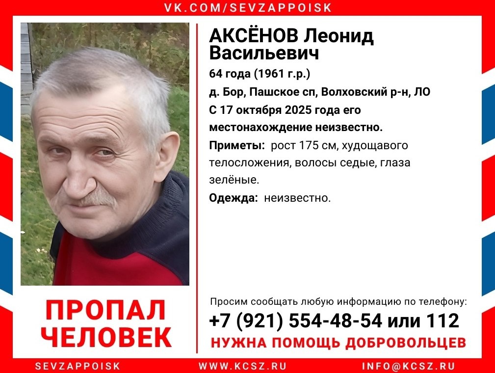 ‼️ В Волховском районе Ленинградской области волонтеры поисково-спасательного отряда «Северо-Запад» разыскивают 64-летнего Леонида Васильевича Аксенова, который пропал 17 октября 2025 года в деревне Бор Пашского сельского поселения. С тех пор о его местонахождении ничего не известно.