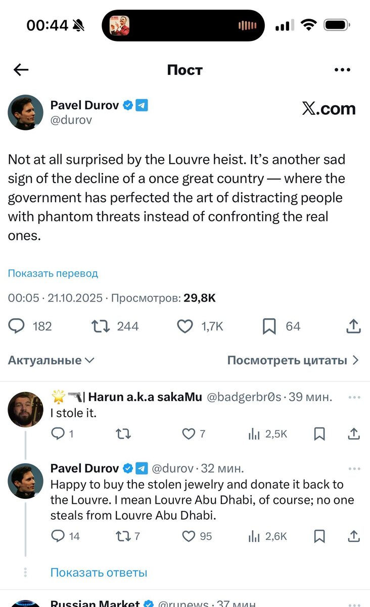 Меня совершенно не удивило ограбление Лувра. Это ещё один печальный признак упадка некогда великой страны, где правительство довело до совершенства искусство отвлекать людей мнимыми угрозами вместо того, чтобы противостоять реальным.