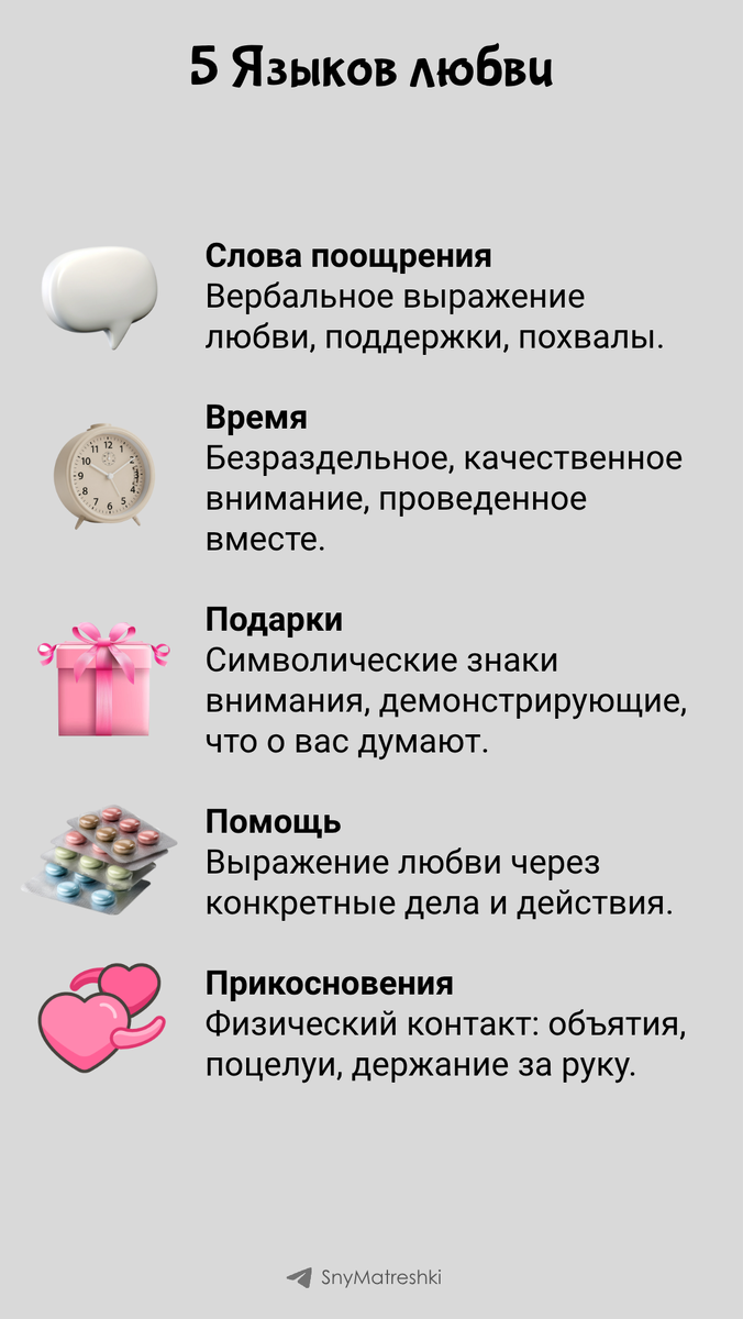 Способы выражения и восприятия любви, которые у разных людей могут кардинально отличаться. Мы часто любим других так, как хотим, чтобы любили нас, но это не всегда совпадает с их "языком". Определите свой основной язык любви и язык вашего партнера. Сознательно выразите любовь на его/ее языке. Поддержать автора Александра Бóгдан,