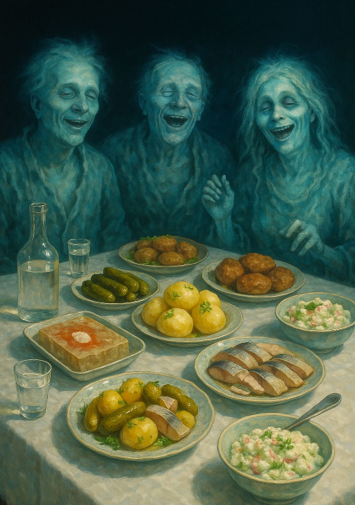 Мне года четыре, может больше. Два семейства собрались у моей крестной, дома. Наши семьи давно дружили, из поколения в поколение. И часто собирались. Какой-то праздник, обычное русское застолье. Водка - самогоночка, огурчики соленые, холодец с хренком, картошечка с селедочкой, котлетки, салатик со сметанкой. Пока писала - слюни потекли…)))