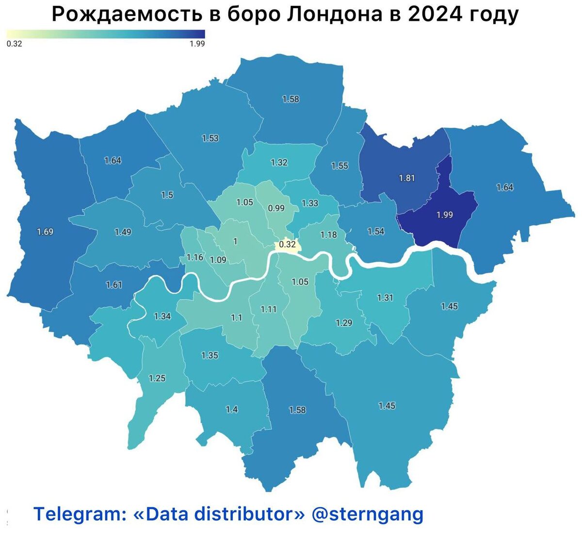 Коэффициент рождаемости в боро (округах) Большого Лондона в 2024 году Коэффициент рождаемости в столице Великобритании колеблется от минимального значения в 0.32 ребёнка в лондонском Сити до максимального значения в 1.99 в боро Банкинг и Дагенем