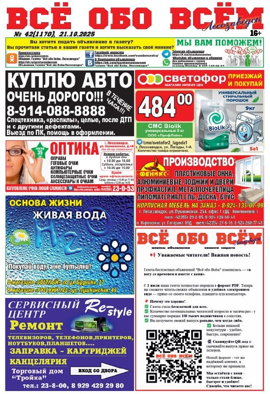 Новый 42-й номер газеты "Всё обо Всём" Лесозаводск от 21 октября можно скачать по ссылке