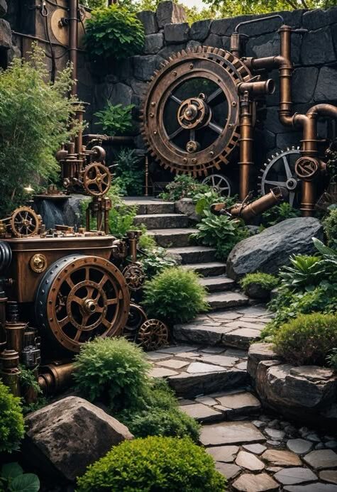 Стимпанк-сады — это не просто композиции, украшенные шестерёнками и латунными трубами. Это маленькие вселенные, в которых природа и индустриальные мотивы не спорят, а создают особую, кинематографичную атмосферу. И главный секрет такого сада заключается не только в декоре, но и в правильном подборе растений. Ведь именно растения помогают создать то самое чувство «заброшенного, но живого мира», где время оставило свои следы, а природа берёт своё. Стимпанк визуально держится на контрастах: холод металла и тёплая органика, прямые линии конструкций и пластичность живых форм, чёткая механика и хаотичная природная логика. Поэтому растения в этом стиле должны быть не просто «зелёным фоном», а эмоциональными акцентами, способными подчеркнуть индустриальный характер окружения. Одни растения создают ощущение древности, словно мир пережил эпоху пара и теперь медленно поглощён растительностью. Другие выглядят графично и чётко, усиливая инженерные линии сада. Третьи — вносят драму цветом или фактуро
