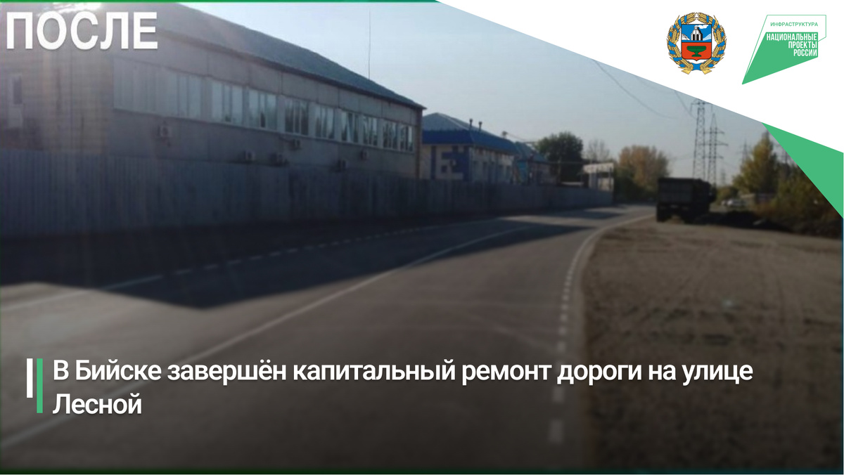 В Бийске завершён капитальный ремонт участка дороги на улице Лесной — от улицы имени Героя Советского Союза Васильева до железнодорожного переезда на улице Социалистической. Работы проведены в рамках национального проекта «Инфраструктура для жизни».