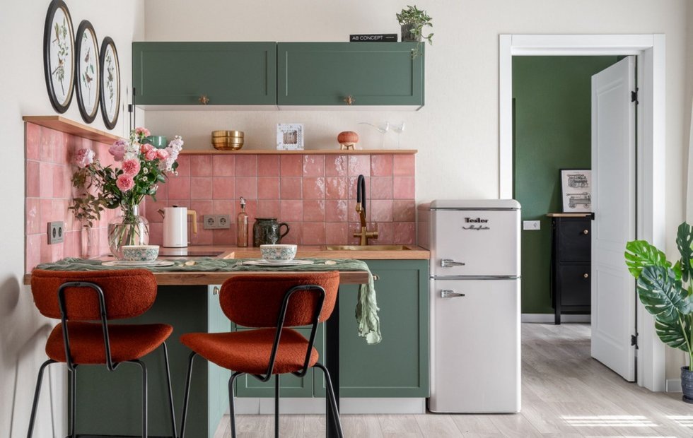 Интерьер вне времени с налетом театральной драматичности Место: п. Кудепста Тип дома: Новостройка Метраж: 33 кв. м Год реализации: 2025 Комнаты: 1 Cанузлы: 1 Высота потолков: 3 м Бюджет: 824 тыс. рублей Дизайн: Анастасия Дубовскова Фото: Элина Габриелян Студия, расположенная в поселке Кудепста близ Сочи, занимает последний этаж жилого комплекса «Летний» и предлагает своим обитателям потрясающий вид на море и лес. Дизайнер Анастасия Дубовскова создала интерьер, отвечающий потребностям как постоянных жителей, так и гостей, которые будут приезжать для отдыха. Хозяйка, молодая женщина с семьей, планирует использовать апартаменты как место для семейного уюта, однако большую часть времени они будут сдаваться в посуточную аренду. Это требовало продумывания универсального и привлекательного дизайна. Планировку от застройщика не меняли, зонирование осуществили с помощью мебельных групп, которые помогли организовать пространство. В результате в студии разместились: место для сна с двухспальной