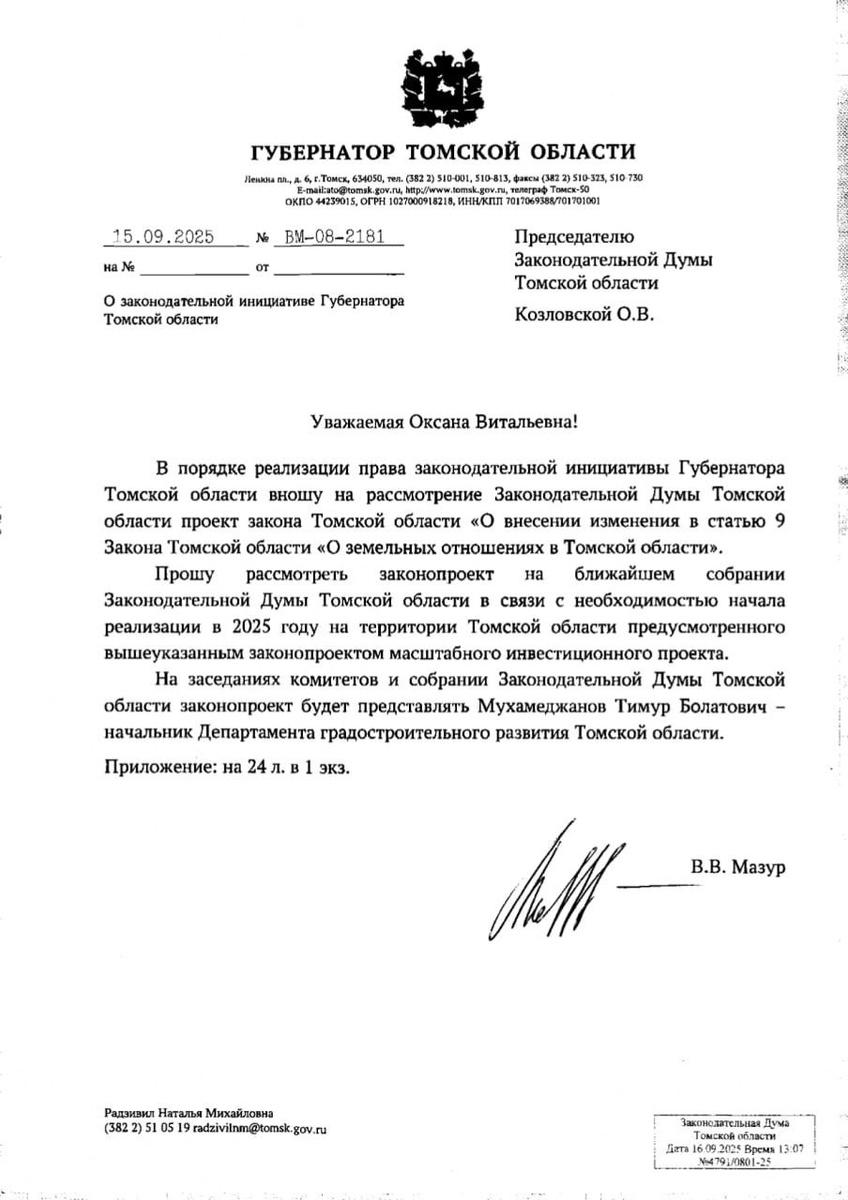 Губернатор Владимир Мазур торопит председателя Законодательной думы Томской области Оксану Козловскую с принятием поправок в закон "О земельных отношениях", согласно которым можно предоставлять землю в областном центре без торгов, если реализуется "масштабный инвестиционный проект". Правда, в соответствии с Федеральным положением о масштабных инвестиционных проектах, запрещается на бесплатной земле строить жильё. Можно в крайнем случае, если в регионе много пострадавших от стихийных бедствий. Но даже если считать стихийным бедствием 1,5 тысячи сирот без жилья, почему не все построенное на бесплатной земле жильё отдаётся им, а.. (внимание, аттракцион неслыханной щедрости) 0,5%! Ещё полгода назад были хотя бы сиротские 3%. Растут аппетиты. В поправках к закону, кстати, есть оговорка, что бесплатно земля предоставляется тем, кто вложит не менее 600 миллионов рублей на удовлетворение "государственных нужд". Но, по моему мнению, это дымовая завеса. Строительство жилья тоже считается государ