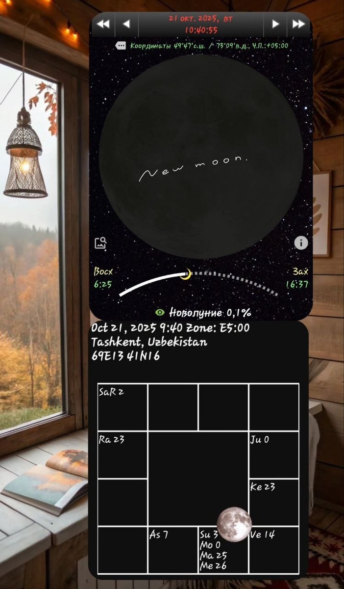 🍃🌜21.10.2025.🌛🍃 Ведическая Астрология Новолуние в Весах. РетроСатурн. Юпитер меняет знак. ☯️Луна сейчас рождается в Весах ... нам очень хочется глубоких и сильных эмоций, нас может тянуть к фундаментальным переменам, даже если это подчас нелегко. Огромное внимание сегодня уделяется отношениям и хрупкому внутреннему равновесию. 🌒Мир в душе- залог мира снаружи. И чем больше людей обретёт его- тем мирнее будет наша жизнь. Не забываем, что каждый из нас- есть частичка Единого, Общего, Целого. 🌒Проведите день максимально спокойно, а вечером можно поразмышлять над планами, обозначить и прописать их на новый Лунный цикл. Делаем глубокий вдох..и живём🙌🧘♀️ Девиз дня: Если яйцо разбивается силой извне - жизнь прекращается, если яйцо разбивается силой изнутри- жизнь начинается. Всё великое начинается изнутри. Извне нас окружают обстоятельства и события, которые лишь могут поспособствовать нашему внутреннему прорыву. Попробуйте ответить себе в этот день на следуюшие вопросы: