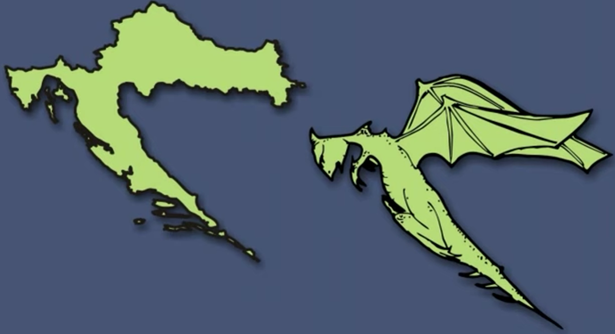 Я выспался и полон сил. Продолжаем? Поеxали! Что насчет Хорватии? Сначала я не мог понять, на что она похожа. Но потом меня осенило — это же самый впечатляющий летающий дракон из всех, что я видел! Вы только посмотрите! Разве это не крутейшая форма для страны? А вот и первый остров — Кипр. С островами проще, их границы четко видны на фоне моря. Но Кипр дался мне нелегко. В итоге я представил себе забавного мышонка, который скачет от радости и пускает ветры. Это Чехия. Мне кажется, она похожа на морскую свинку, которая прячется за скалой. Скалу тут изображают границы с Австрией и Словакией. Видите? А вот один из моих фаворитов — Дания. Слева мы видим толстую версию Бэтмена, который только что выбрался из какой-то неприятной истории, и рыбу, которая объедает слизь с его живота. А еще какое-то странное, похожее на призрака существо, которое на него указывает и, кажется, кричит на толстого Бэтмена. Любопытная компания, не правда ли? Эстония показывает два «лица». Одно — голова леопарда