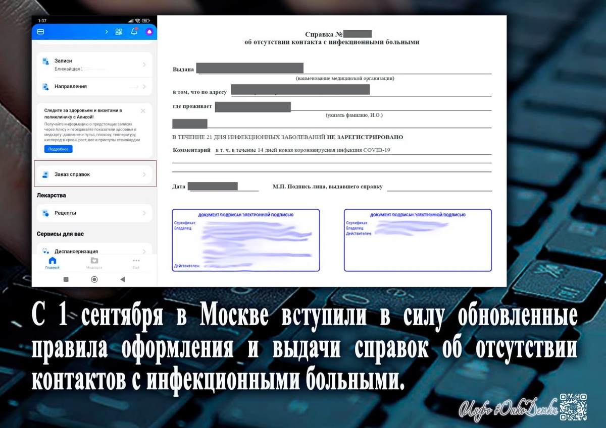 Изменения в получении справок об отсутствии контактов с инфекционными больными (с 1 сентября) С 1 сентября в Москве вступили в силу обновленные правила оформления и выдачи справок об отсутствии контактов с инфекционными больными. Как получить: Законный представитель маленького пациента может самостоятельно запросить такую справку в разделе "Справки" своего Личного кабинета на портале mos.ru или в приложении ЕМИАС.ИНФО. Заявка автоматически поступает в поликлинику (медицинское учреждение, к которому прикреплен пациент). Справки формируются централизованно через систему ЕМИАС и приходят с электронной подписью. Автоматический сбор данных: Запрос обрабатывается в специальной системе, которая автоматически подтягивает данные об эпидемиологическом окружении ребенка как по месту жительства, так и с места учебы. Отслеживание: Готовность справки можно отслеживать в вашем Личном кабинете на портале mos.ru или через приложение «ЕМИАС.ИНФО». Какие справки можно заказать онлайн? Через этот же се