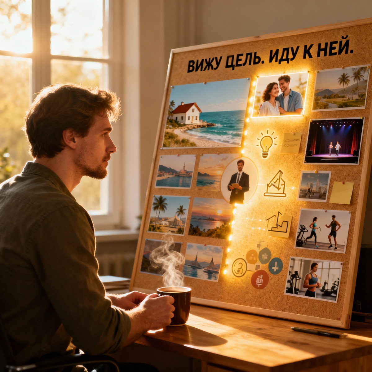 Максим, 29 лет, хотел улучшить физическую форму. Годами откладывал. Создал доску визуализации: фото спортивного тела, здорового питания, марафона, на котором хотел бы пробежать. Повесил на кухне. Каждое утро, делая кофе, видел доску. И незаметно начались изменения: выбирал овсянку вместо пончиков (глядел на фото здоровой еды), пошёл в зал (видел спортивное тело), записался на забег (видел марафон). Через год он пробежал свой первый полумарафон. Доска визуализации работала как ежедневное напоминание "вот куда я иду", и это влияло на сотни мелких решений каждый день. 🏃