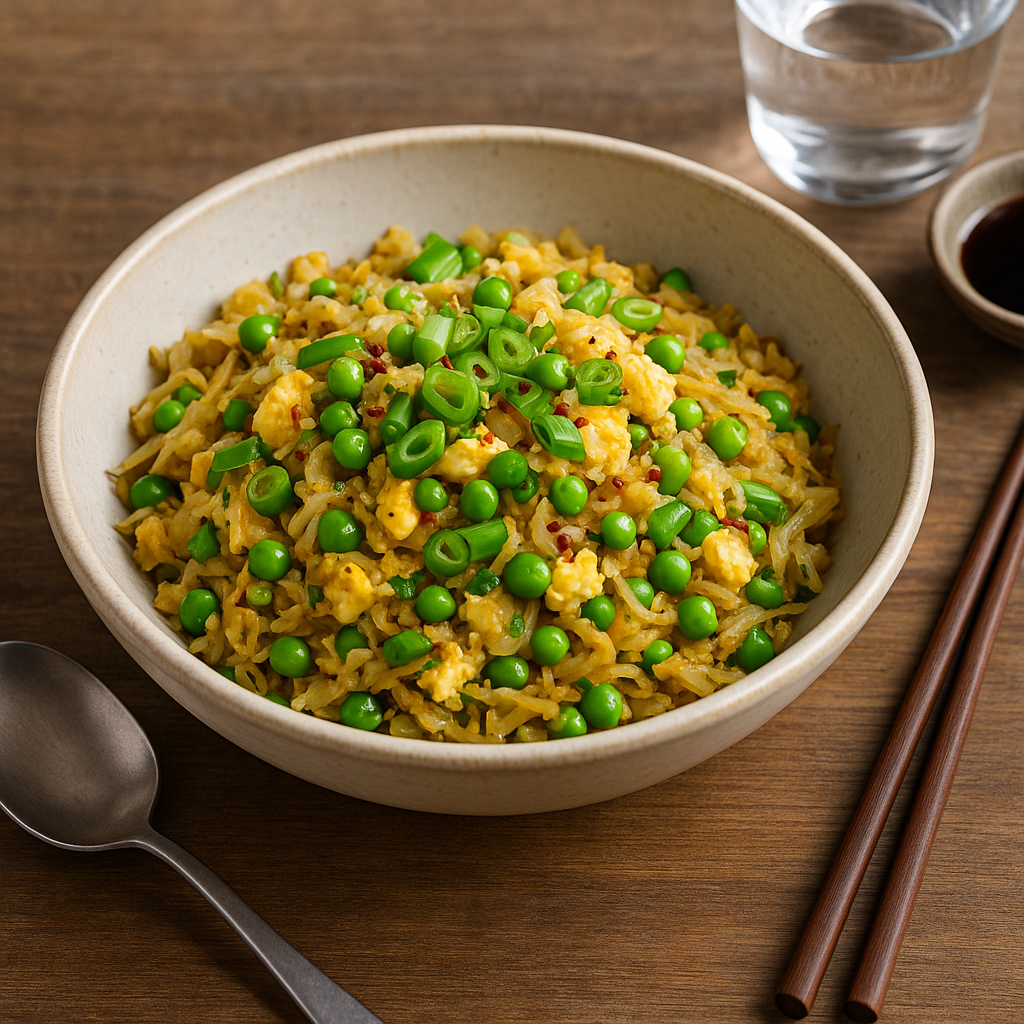 - Соедините всё. Добавьте горошек, соевый соус, перец и (если любите) немного острого соуса. Перемешайте и прогрейте ещё минуту.