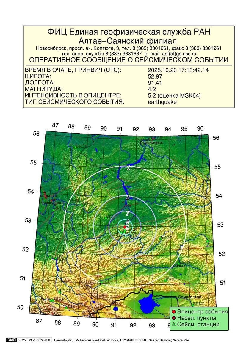 Ночью в Хакасии зафиксировано землетрясение магнитудой 4,2 По информации Алтае-Саянского филиала Единой геофизической службы РАН, в 00.13 в Бейском районе Хакасии произошло сейсмическое событие магнитудой 4,2. Пострадавших нет. Саяно-Шушенский гидроэнергокомплекс работает в штатном режиме.