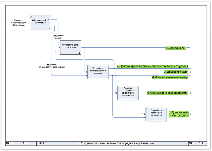 Базовые элементы лучше рассматривать в логической цепочке: Дерево целей → функциональные цепочки к целям → дерево функций → функциональная матрица → управленческая организационная диаграмма (структура) → должностные инструкции.