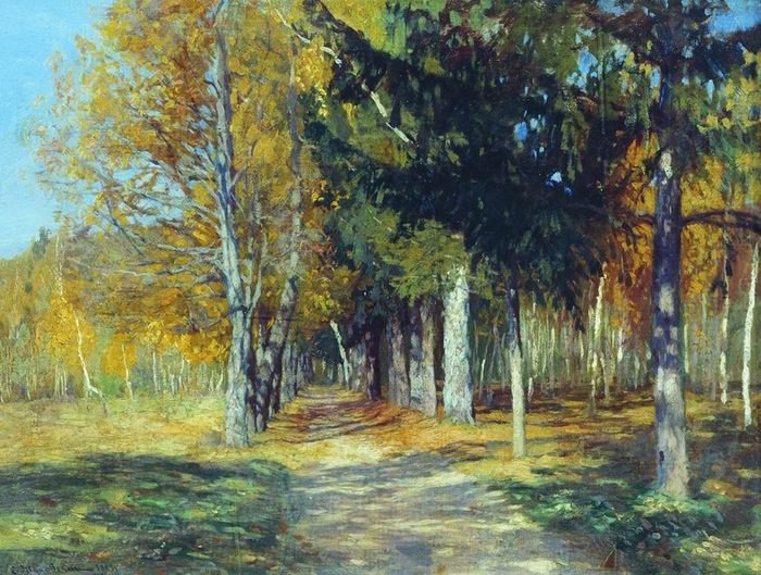 ☀ А на колокольне тоненько колокол бьёт - #Заутреня ☔ Дождь льет с самого утра, Льет как будто из ведра, И как крупные цветы Распускаются зонты. #АнжелаБерлов 🖼 «Ясная осень. Бабье лето». 1899. #СтаниславЖуковский & #РусскаяПоэзия & #УтроОктябрь .......Никакого селения кругом не видно.