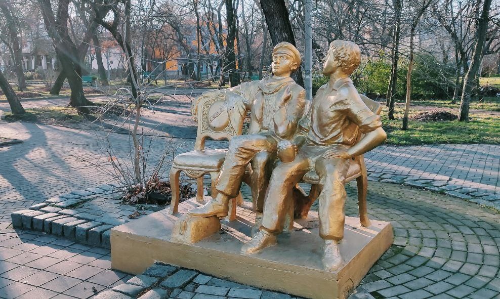 "Остап Бендер в своем знаменитом шарфе и Шура Балаганов с рыжей шевелюрой восседали на бронзовых стульях, а справа от Остапа стоял третий