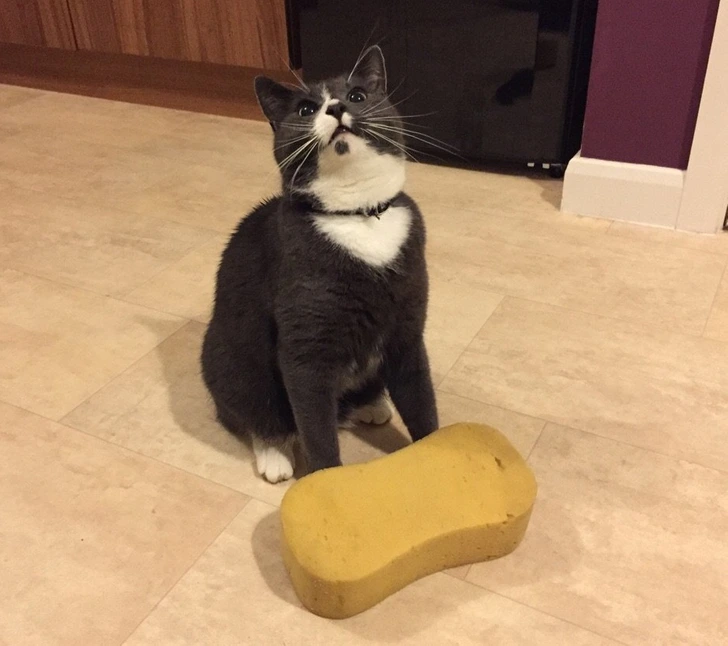 Коты — настоящие ценители бытового веселья и мелких находок! Почему-то губка для посуды у них всегда вызывает неподдельный интерес: понюхают, покрутят лапой и, конечно, потащат по всей квартире. На этом фото отличный пример — серьезное кошачье лицо и рядом трофей, который явно был добыт не просто так. Видимо, губка для кота — примерно как мышь, только проще поймать и никто не ругает!