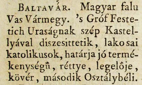 «Балтавар. Венгерский аул в области Ваш. Украшением Балтавара является красивый дворец графа Фештетича. Жители аула католики. Поля в окрестностях Балтавара хорошей плодородности, а луга и пастбища обильные, которые оцениваются второй категорией».