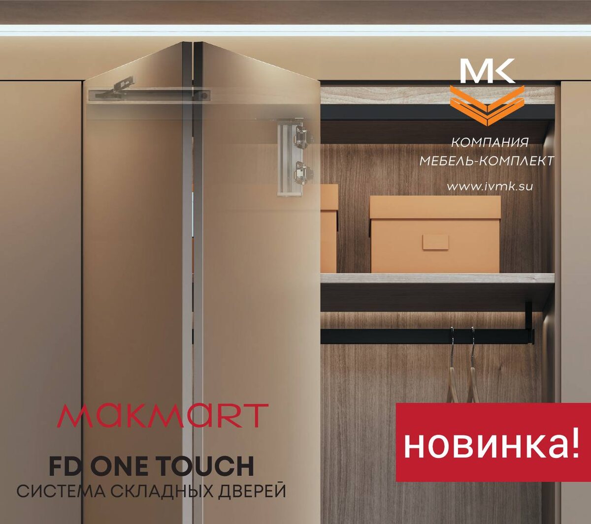 🔥Представляем новинку от MAKMART, система складных дверей FD ONE TOUCH. ☝️ Это одно из немногих решений на мебельном рынке, позволяющее организовать шкаф со складными дверями без ручек. 🔸 Особенностью системы является то, что при нажатии на фасад двери открываются посредством механического толкателя, он же выполняет функцию доводчика при закрывании дверей. 🔸 Система предназначена для установки на фасады высотой до 2400 мм и весом до 40 кг. 🔸 Высокая плавность хода обеспечивается двумя направляющими с ходовыми элементами, за высокую грузоподъемность отвечают петли с двойной чашкой. 👍 Доступно к заказу в «Мебель-Комплект»! #MAKMART