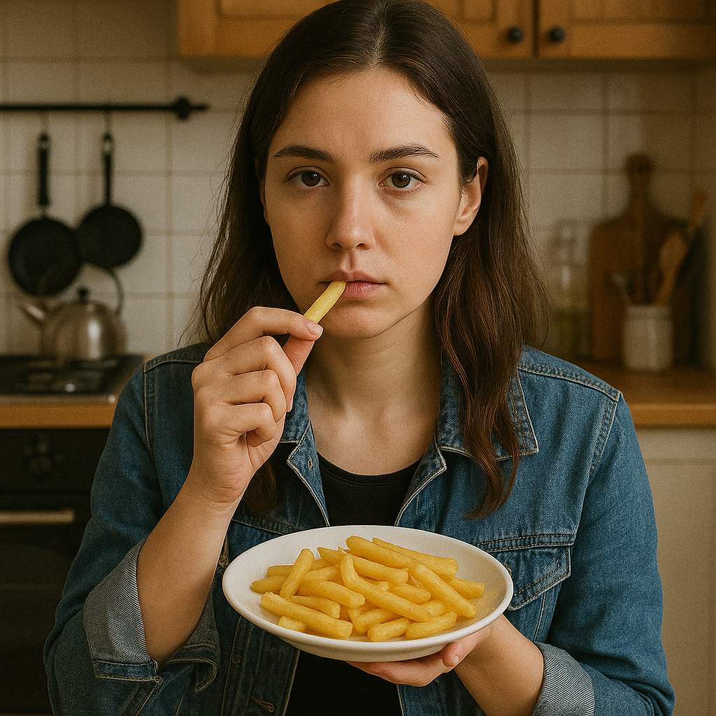 Знаете, иногда меня спасает… картошка фри. Нет, правда. Один вечер, одна сковорода, одна порция — и всё вроде бы становится легче. Но однажды я поняла: не фри помогает, а сам факт, что я хоть что-то делаю для себя. Эта история случилась после того, как я два часа укладывала детей, получила три срочных задачи с работы и забыла про свою онлайн-йогу (обожаю её, кстати). Села на кухне. Темно. Тихо. И я жарю картошку. Но не потому что хочу есть. А потому что внутри — тревожно, напряжённо и пусто. На следующий день я наткнулась на статью про эмоциональное переедание. У меня было ощущение, будто кто-то взял и описал мою вечернюю жизнь! Стало так спокойно от одной мысли: я не одна, и это не значит, что со мной что-то не так. Теперь я каждый раз, когда тянусь к перекусу "на нервах", спрашиваю себя: "Ты устала? Тебе грустно? Или просто хочешь выдохнуть?" Иногда после этого я всё равно ем фри. Но чаще — беру тёплый плед, ставлю сериал и позволяю себе просто побыть. Девочки, мы имеем право на уста