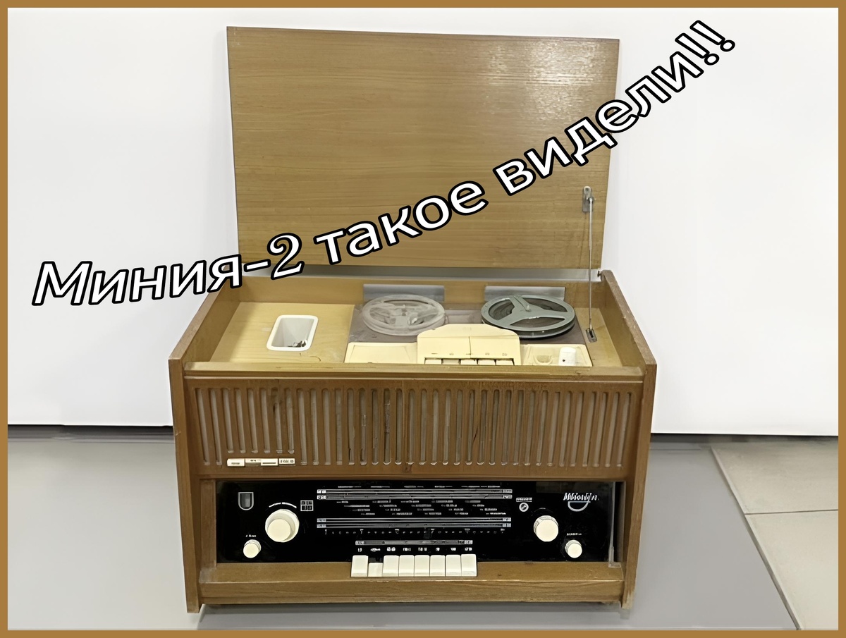 Никогда я этого не видел, и только после посещения музея винтажной электроники я увидел это чудо. Жаль, что прикасаться нельзя. Магнитола Миния-2 представляет собой уникальное устройство советской эпохи, объединяющее в себе функции радиоприёмника и магнитофона. Аппарат относится к первому классу и отличается высоким качеством исполнения. супергетеродинной схеме на восьми лампах с навесным монтажом на стальном шасси. Устройство работает в следующих диапазонах: ДВ: 150–408 кГц (2000–735,3 м); СВ: 520–1600 кГц (577–187,5 м); КВ1: 9,36–12,1 МГц (32,0–24,8 м); КВ2: 3,95–7,4 МГц (75,9–40,5 м); УКВ: 65,8–73 МГц (4,56–4,11 м). Магнитофонная панель Эльфа-25 третьего класса, производства Вильнюсского электротехнического завода, унифицирована с магнитофоном Айдас. Основные характеристики: относительная шумовая мощность: –38 дБ; коэффициент нелинейных искажений: 5%; коэффициент детонации: 0,4%; частота генератора тока подмагничивания: 55 кГц; выходная мощность УНЧ: 1,5 Вт. Магнитола Миния-2 являе
