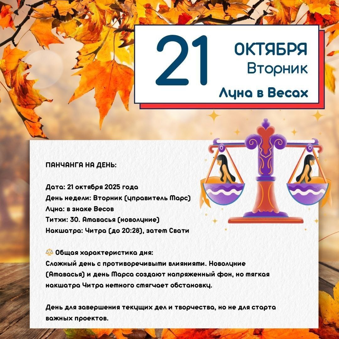 Астродайджест на вторник, 21 октября Вторник — день Марса. Распределите силы правильно! 🌙 Главные астро-события дня 🔸 До 15:25 — Новолуние в Весах. Идеальный момент, помолиться за предков. 🔸После 15:25 — стартуют 1-е лунные сутки. Начало нового цикла! Энергия очень чистая, но хрупкая. Лучше планировать и мечтать, а не бросаться в бой. 🔸 Планета дня — Марс в тандеме с Солнцем, Луной и Меркурием. Следите за самооценкой. Спрашивайте себя: чего я действительно хочу? Главное — направить эту энергию в конструктивное русло. ✨ Накшатра дня: Читра ("Сияющая") Энергия этой звезды — это энергия творца, дизайнера и архитектора своей жизни. Она призывает к проявлению харизмы и элегантности во всем. Что БЛАГОПРИЯТНО делать: ☂️Всё для здоровья и красоты тела: тренировки, массажи, спа-процедуры. 🏡 Ремонт, декор, создание уюта в доме. ✏️ Любое творчество, ремесла, работа с механизмами. 🤍 Публичные выступления и общение с противоположным полом. 🕯 Духовные практики и визуализация желаний.